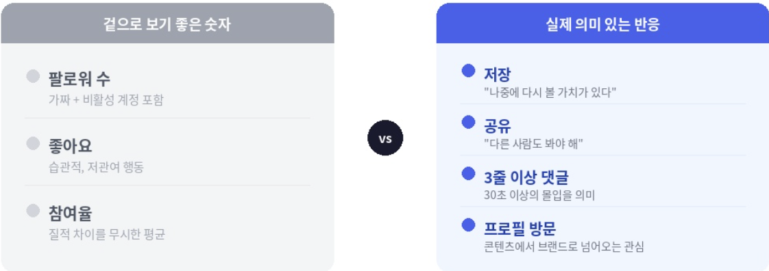 많은 브랜드가 아직도 팔로워 수, 좋아요, 참여율을 캠페인 성과의 기준으로 삼습니다. 보기엔 좋지만, 이 숫자들은 매출과는 거리가 먼 경우가 많습니다¹. 팔로워 수에는 가짜와 비활성 계정이 섞여 있고, 좋아요는 습관적이고 저관여적인 행동이며, 참여율은 서로 다른 행동을 하나로 뭉쳐서 질적 차이를 무시합니다.