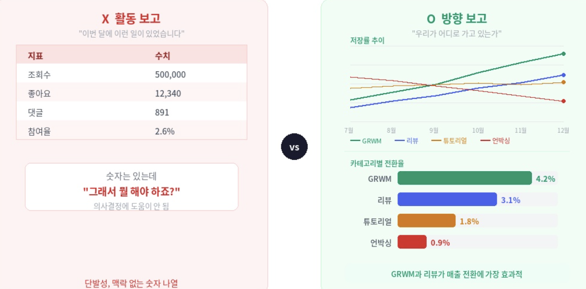 "이번 달 진행한 캠페인에서 이 정도의 조회수와 댓글이 달렸고 이만큼 전환이 일어났습니다" 식의 보고는 어떠한 인사이트도 주지 못합니다. 대신 "우리 브랜드 이번 분기 KPI 달성을 위해서 인플루언서 시딩 마케팅 전략을 채택했고, 이번 달 위와 같은 성과가 났습니다. 다음 달에는 이런 점들을 개선해 전환 비용을 낮추고자 합니다" 처럼 방향성이 드러나는 보고가 의미있습니다.