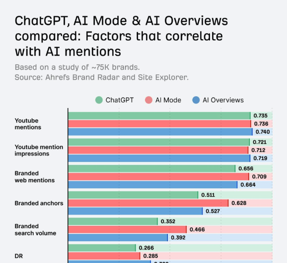 유튜브에서 우리 브랜드가 멘션된 횟수였습니다. 상관계수 0.737². 7만 5천 개 브랜드를 분석한 데이터에서 나온 결과예요. 누군가가 유튜브 영상에서 우리 제품 이름을 몇 번 말했느냐가, 우리가 공들인 SEO보다 AI 가시성에 더 큰 영향을 줍니다.