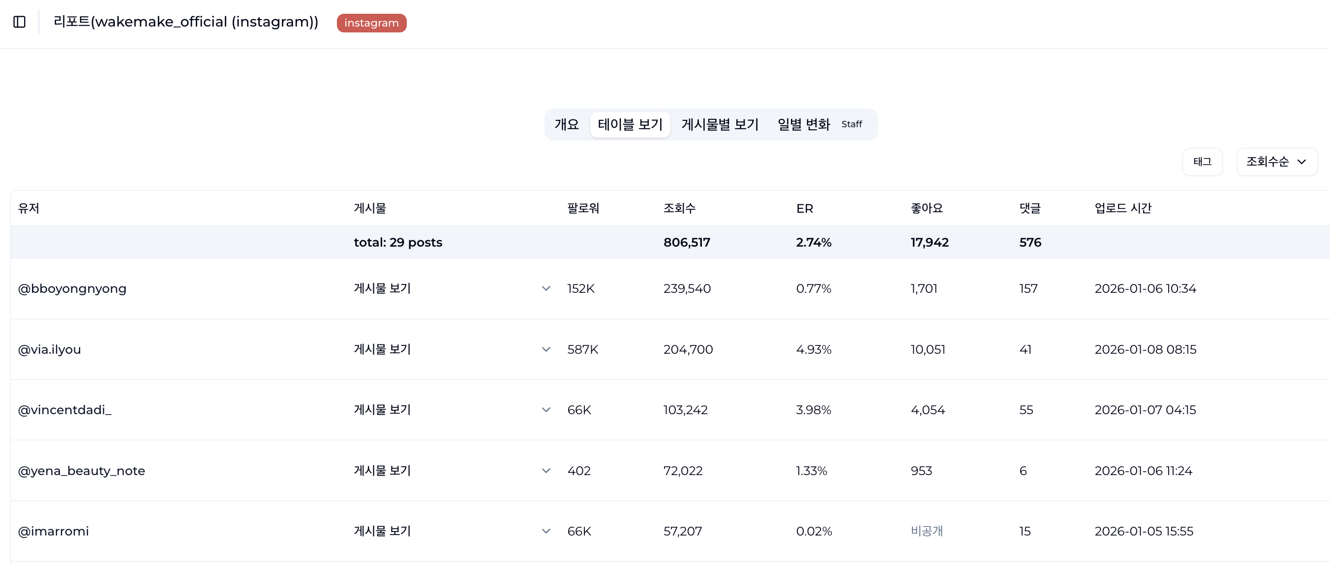 인플루언서의 조회수 및 인게이지먼트 성과를 데일리로 트래킹할 수 있습니다.