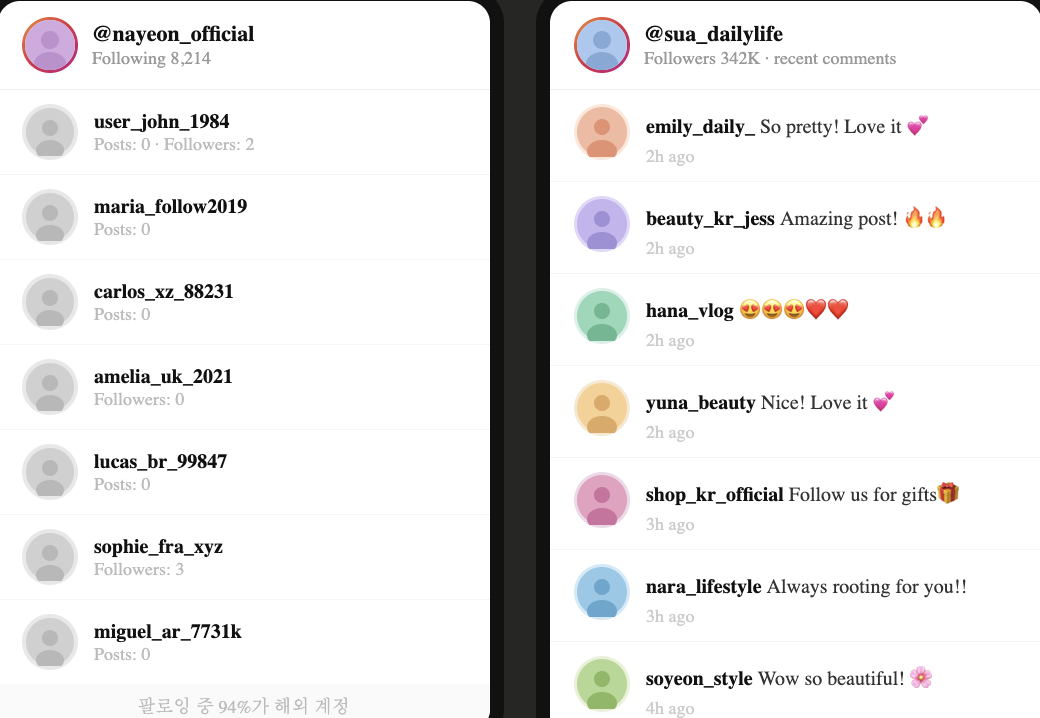 초기의 가짜 팔로워는 프로필 사진이 없거나, 게시물이 0개이거나, 팔로워 대비 팔로잉 비율이 극단적이었습니다. 눈으로 봐도 어색했습니다.